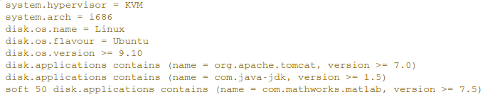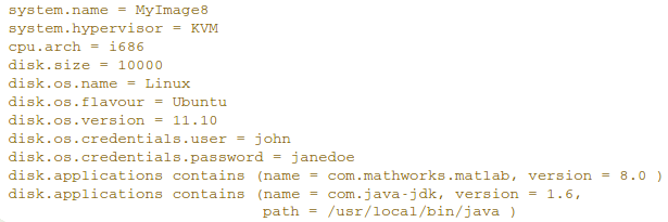 The capabilities of the VMI are expressed via a simple key-value language. For example, the following snippet of code describes a VMI created for the KVM hypervisor with i686 architecture, 10000 MBytes of hard disk and with Ubuntu 11.10 Linux installed. The users can connect via ssh to the VM with the account john and password janedoe. In addition, the VMI has Matlab 8.0 and the Java JDK 1.6 installed.