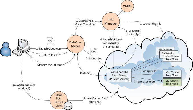 One of such examples is the case of CodeCloud: A platform to enable execution of programming models on the Clouds a work published in the Journal of Systems and Software, in which is presented a platform that supports the execution of scientific applications covering different programming models (such as Master/Slave, Parallel/MPI, MapReduce and Workflows) on Cloud infrastructures. The VMRC is employed to transform from high-level programming model to the specific VMI which includes the support to execute applications written for that programming model. The figure (at the right) describes the architecture of the CodeCloud platform.