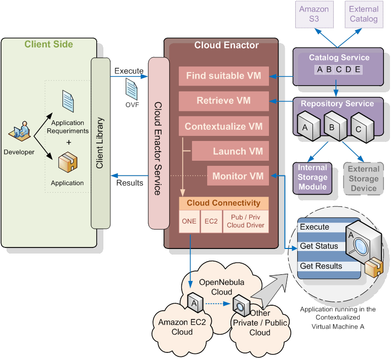 The scientific jobs to be executed incorporate application requirements (OS requirements, application dependencies, etc.) and are submitted to a Cloud Enactor which uses the job's requirements to query the VMRC catalog for the most appropriate VMIs to execute the applications. The VMIs are stored in OpenNebula's own repository. The reminder sofware not available in the VMIs is deployed using a DevOps tool (i.e. Ansible) at runtime. This procedure enables to deploy an infrastructure to support the execution of scientific applications. This procedure is supported by the Infrastructure Manager (IM) which contacts the VMRC for VMI matchmaking.